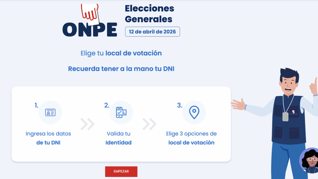 La Oficina Nacional de Procesos Electorales (ONPE) activó desde el domingo 23 de noviembre el portal «Elige tu local de votación» para los comicios generales de 2026. La herramienta permite que los electores peruanos seleccionen hasta tres opciones de local de sufragio dentro de su distrito, Lo cual busca facilitar el acceso al voto y reducir desplazamientos»